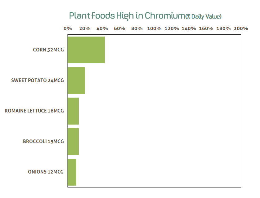 - Plant foods high in Chromium including cocoa powder (unsweetened), corn on the cob, sweet potato, onion, broccoli, tomato, Romaine lettuce