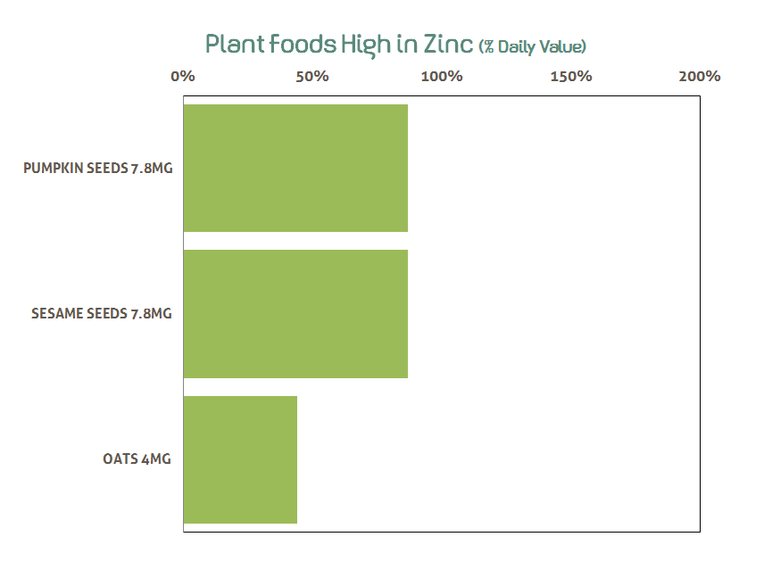 - Plant foods high in Zinc including pumpkin seeds, sesame seeds, oats