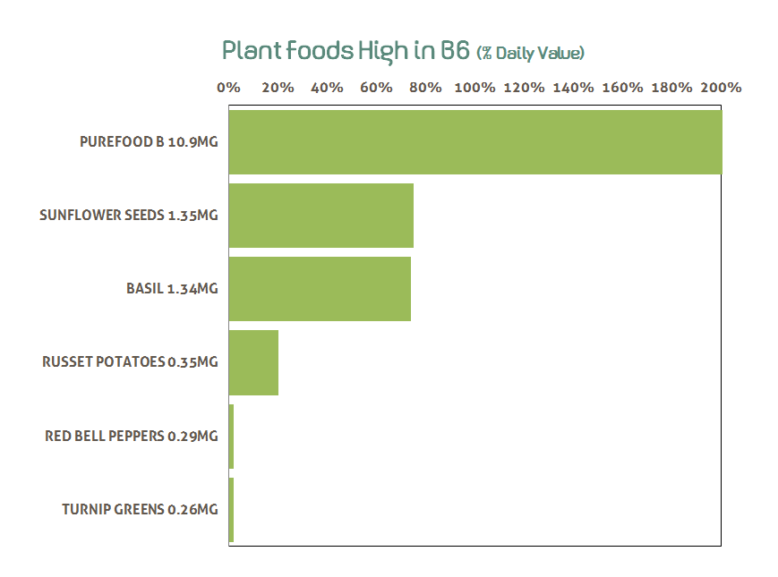 - Plant foods high in Vitamin B6 include sunflower seeds, dried basil, Russet potatoes, red bell peppers, turnip greens
