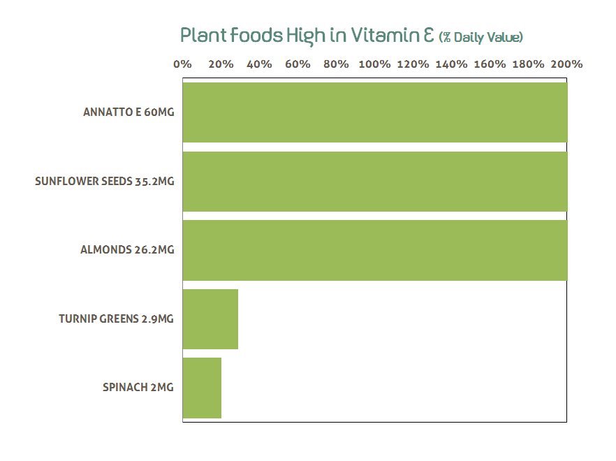 - Plant foods high in Vitamin E include sunflower seeds, almonds, turnip greens, spinach