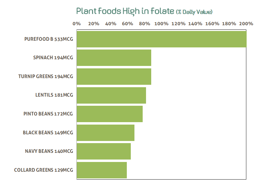 - Plant foods rich in B-vitamins (includes Folate): asparagus, romaine lettuce, mushrooms, spinach, sunflower seeds, green peas, tomatoes, eggplant, Brussel sprouts, cauliflower, broccoli, turnip greens, bell peppers, seaweeds, algae