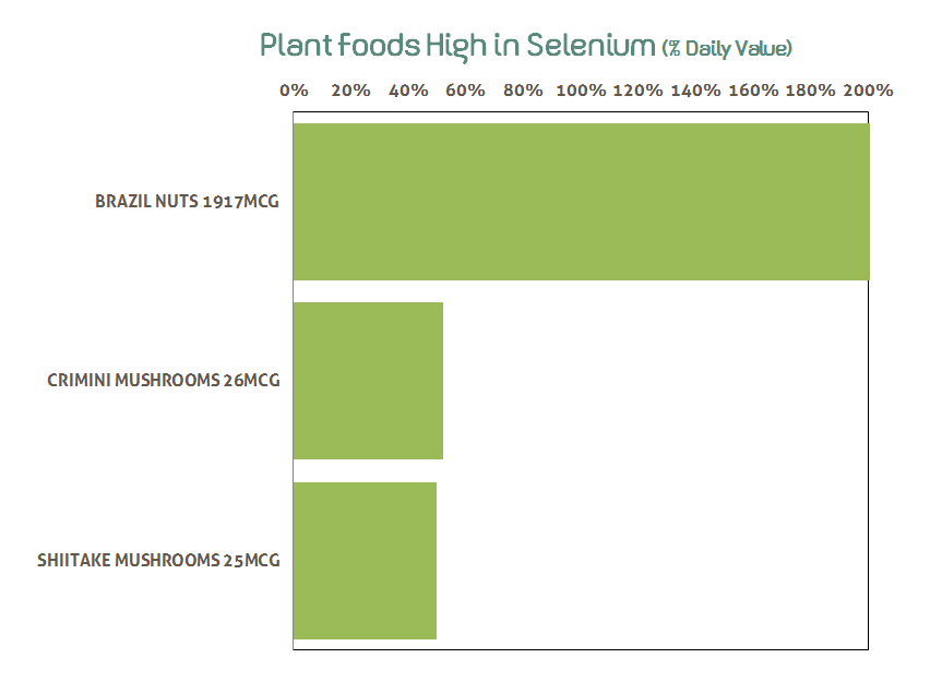 - Plant foods rich in Selenium: brazil nuts, crimini mushrooms, shiitake mushrooms
