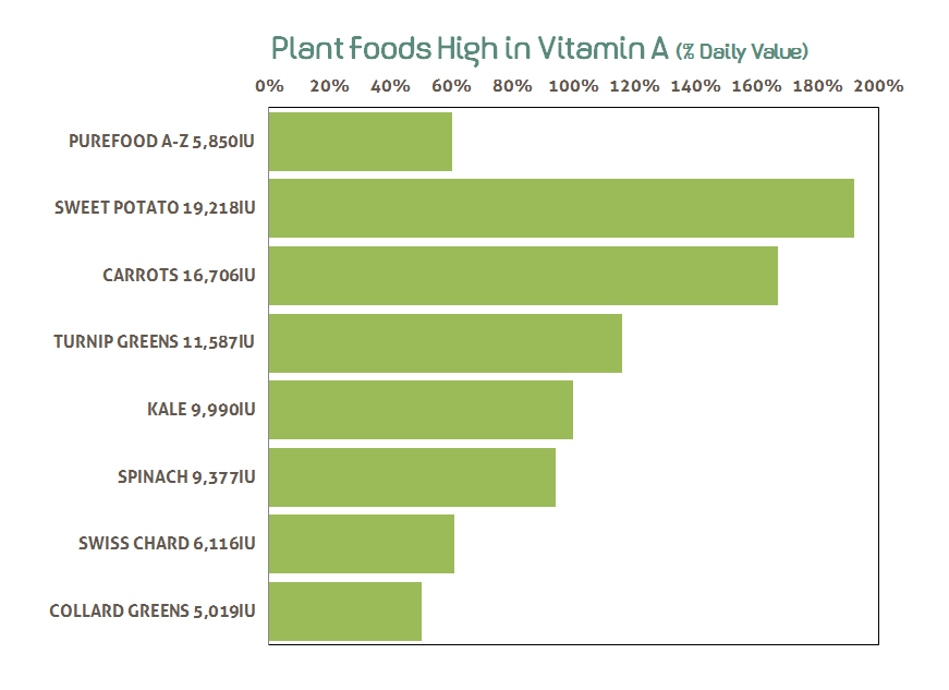 - Plant foods rich in Vitamins A: carrots, winter squash, tomatoes, green beans, cilantro, Swiss chard, sweet potatoes, kale, spinach, turnip greens, collard greens